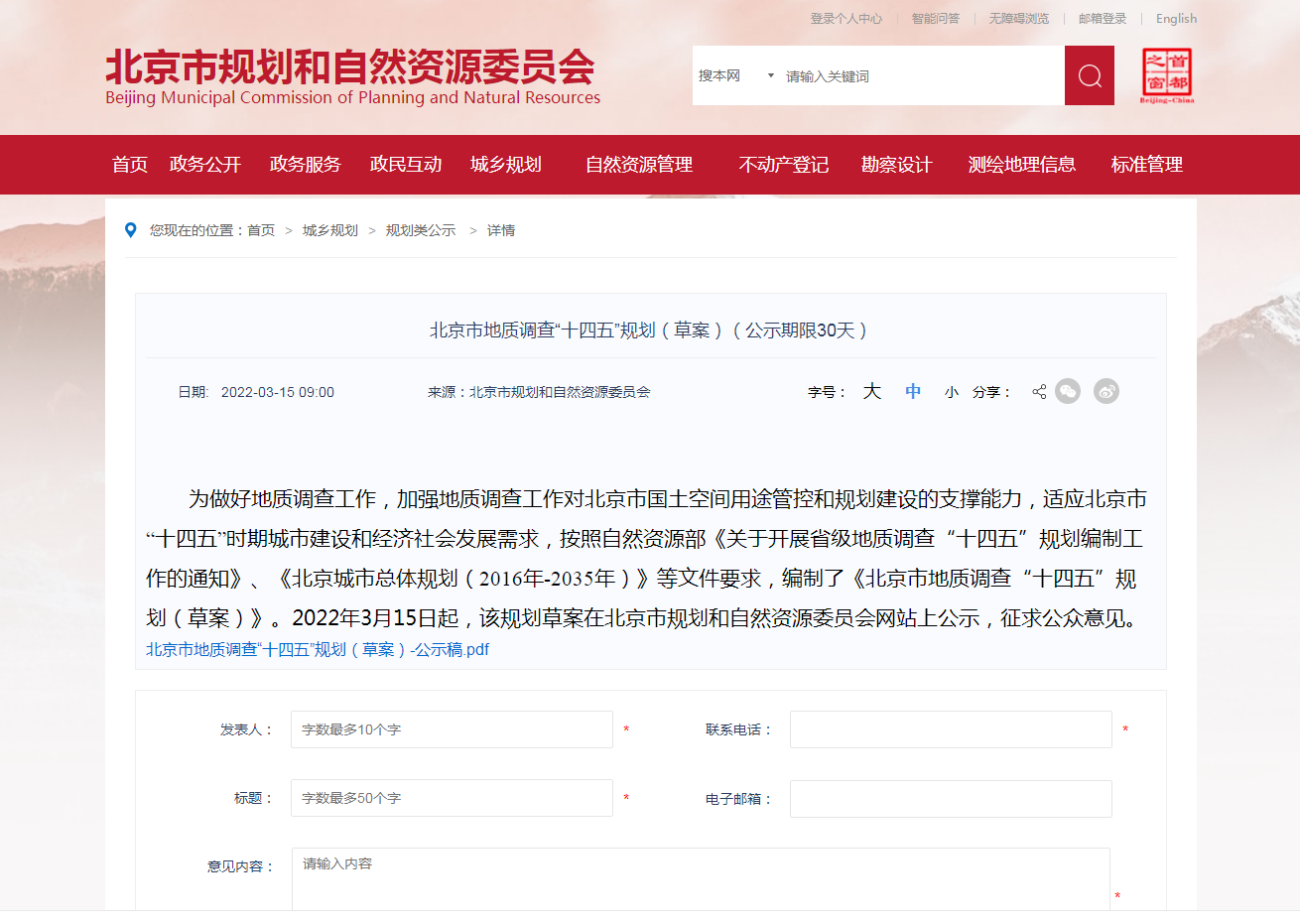 地大熱能地?zé)?多能互補(bǔ)網(wǎng)訊:《北京市地質(zhì)調(diào)查“十四五”規(guī)劃(2021—2025年)(草案)》(以下簡(jiǎn)稱《草案》)3月15日起在市規(guī)劃自然資源委網(wǎng)站公示,聽(tīng)取公眾意見(jiàn),公示期30天?!?a href="http://m.kcsoundproductions.com/t/規(guī)劃.html" >規(guī)劃》提出,北京市將率先對(duì)首都功能核心區(qū)地?zé)崮?/a>等開(kāi)展綜合地質(zhì)調(diào)查評(píng)價(jià),提供地質(zhì)安全保障。社會(huì)公眾對(duì)該《規(guī)劃》如有意見(jiàn)建議,可在4月14日前登錄北京市規(guī)劃自然資源委網(wǎng)站留言。