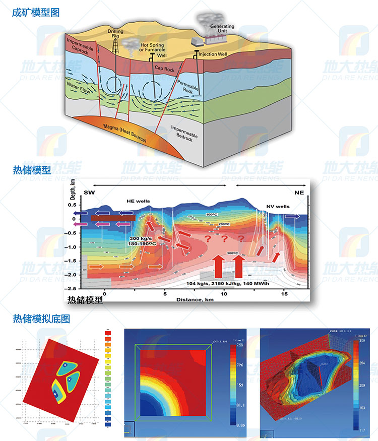 ⑤根據(jù)地質(zhì)、地球物理、地球化學(xué)、錄井、試井等資料,建立熱儲模型,預(yù)測熱儲開采動態(tài)及開發(fā)時期可能獲得的產(chǎn)量,熱田地質(zhì)環(huán)境變化,最終建立地?zé)崽镩_發(fā)利用的優(yōu)化管理模型。