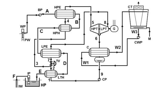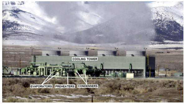 最新的USGeo拉夫特河發(fā)電站坐落在起初的電站南南東方向約600m的地方。這個最新的發(fā)電機組的能量對流系統(tǒng)是一個部分回熱,二級,雙壓力雙循環(huán)發(fā)電機組。有兩個單獨的單元,每一個單元都有兩個軸向流動的渦輪來驅(qū)動同一個中心發(fā)電機。一個四室的水冷卻塔為殼管冷凝器(shell-and-tube condensers)提供冷卻提供冷卻水。補充水是從水井中獲取的,而且需要及時處理來維持冷卻塔中的水的質(zhì)量。138℃的鹵水以大約3.15×106kg/s的速度泵向蒸發(fā)器和預(yù)熱器,循環(huán)工質(zhì)異戊烷(i-C5H12)就是在蒸發(fā)器和預(yù)熱器中吸收溫度的。換熱器只在高壓循環(huán)中才使用。