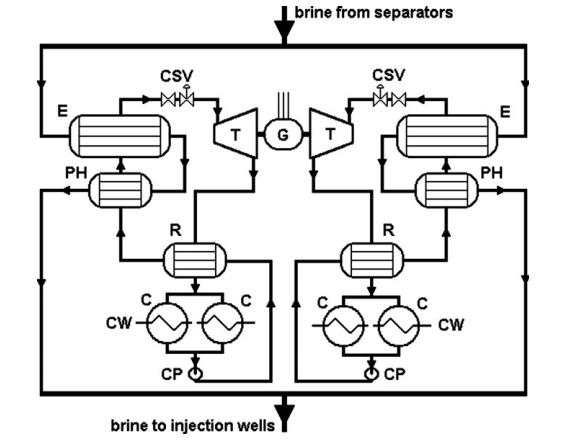 米拉瓦列斯的五號發(fā)電機組是2004年剛投入使用的。這個發(fā)電機利用從一號和二號和三號發(fā)電機組中的廢棄鹵水,通過注入井來獲取了可能回到熱儲層中的能量??偣驳陌l(fā)電量是15.5MW,發(fā)電機組中的每一個發(fā)電單元都發(fā)出7.75MW的電。每一個發(fā)電單元是有兩個渦輪組成的,驅(qū)動同一個發(fā)電機。循環(huán)工質(zhì)是常規(guī)的正戊烷,C5H12。每一個單元用兩個預(yù)熱器。兩個蒸發(fā)器跟他們各自的分隔板。兩個回?zé)崞?,四個水冷凝器。這個發(fā)電機組是有澳瑪特(Ormat)提供的。