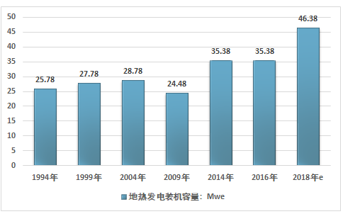 截止2018年年底,中國地區(qū)地熱發(fā)電累計裝機約46.38MWe。